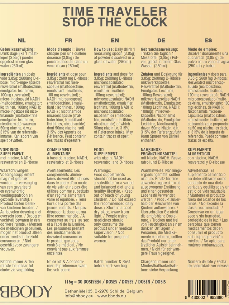 De Time Traveler combineert wetenschappelijk bewezen ingrediënten in een liposomale samenstelling voor een verhoogde opneembaarheid en effectiviteit. NAD en resveratrol staan bekend om hun ondersteunende werking op celvernieuwing en verouderingsprocessen, terwijl nicotinamide en D-Ribose bijdragen aan een verbeterd energiemetabolisme.